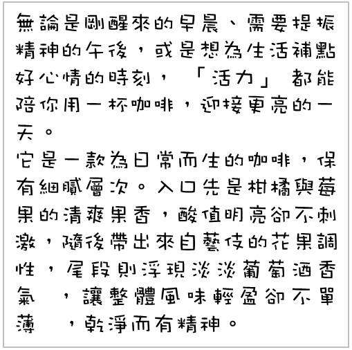 無論是剛醒來的早晨、需要提振精神的午後,或是想為生活補點好心情的時刻, 「活力」 都能陪你用一杯咖啡,迎接更亮的一天。